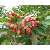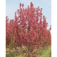 絢麗海棠 小喬木,樹形緊密,干棕紅色,高4.5—6米,小枝暗紫色。樹皮縱裂,多刺狀短枝。嫩葉紫紅色,逐漸變?yōu)榇渚G,花期4月下旬,花深粉紅色,花開繁而密,果實亮紅色,燈籠形,。著果密,萼宿存,六月果實成熟,結(jié)果豐富,掛果可長達數(shù)月。