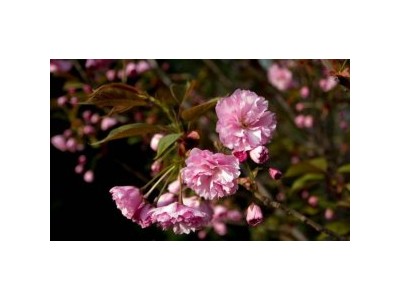 中華晚櫻,薔薇科櫻屬,晚櫻中的變種,喬木,4月10日左右始花,總體花期長達38天左右,先花后葉,傘形花序,重瓣,大輪,花徑為5-6厘米,雄蕊變瓣,雌蕊葉化,不結(jié)實。初花期濃紅色,盛花期深粉紅色,此時綠葉綻放,葉片同比其它晚櫻較長且寬,葉緣鋸齒也齒裂較深,新葉淺紫褐紅,逐步變綠,綠葉襯紅花,別有意境。秋葉橙黃色,可媲美銀杏。