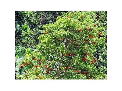 名稱:假蘋婆(廣東)雞冠木(茂名),賽蘋婆(中國樹木分類學(xué))圖版36:拉丁文名:Sterculia lanceolata Cav.科:梧桐科 STERCULIACEAE屬:蘋婆屬 Sterculia Linn. 原產(chǎn)于我國廣東、廣西、云南、貴州和四川及中南半島各國。 形態(tài)特征: 葉:葉具柄,近革質(zhì),橢圓狀矩圓形近披針形,長7-15厘米,寬2.5-7厘米,全緣,禿凈;葉柄長1.5-3.5厘米?;ǎ簣A錐花序分枝多,柔弱,無柄,腋生,通常短于葉,多少被以絨毛,萼5裂幾達(dá)基部,裂片矩圓狀披針形,長約6毫米,雄花的較短,擴(kuò)展,淡粉紅色,外被星狀小柔毛,雄芯柱短于萼而通常內(nèi)彎,花藥10枚,近無柄,生于雄芯柱的極短裂片的外面,形成一頂生的圓頭。蓇葖果稍被茸毛,近于無柄每個指,矩圓形,長2.5-5厘米,寬1.2-1.5厘米,鮮紅色,有黑褐色的種子1-5顆,花期:4月。 喬木,小枝幼時被毛。葉橢圓形、披針形或橢圓狀披針形,長9-20厘米,寬3.5-8厘米,頂端急尖,基部鈍形或近圓形,上面無毛,下面幾無毛,側(cè)脈每邊7-9條,彎拱,在近葉緣不明顯連結(jié);葉柄長2.5-3.5厘米。圓錐花序腋生,長4-10厘米,密集且多分枝;花淡紅色,萼片5枚,僅于基部連合,向外開展如星狀,矩圓狀披針形或矩圓狀橢圓形,頂端鈍或略有小短尖突,長4-6毫米,外面被短柔毛,邊緣有緣毛;雄花的雌雄蕊柄長2-3毫米,彎曲,花藥約10個;雌花的子房圓球形,被毛,花柱彎曲,柱頭不明顯5裂。蓇葖果鮮紅色,長卵形或長橢圓形,長5-7厘米,寬2-2.5厘米,頂端有喙,基部漸狹,密被短柔毛;種子黑褐色,橢圓狀卵形,直徑約1厘米。每果有種子2-4個?;ㄆ?-6月。廣東假蘋婆-云南假蘋婆-四川假蘋婆-湖南假蘋婆-貴州假蘋婆-福建