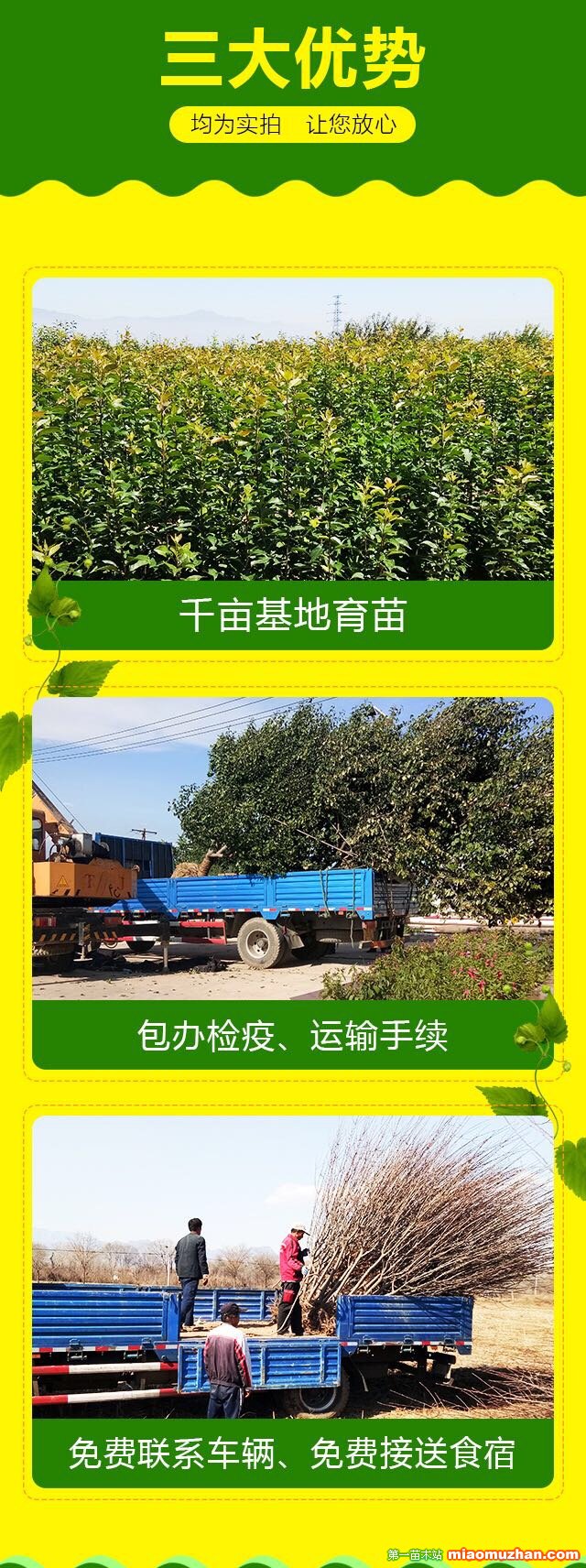 張家口東茂日盛海棠苗木有限公司位于河北省懷來(lái)縣小南辛堡鎮(zhèn)段家莊村,有著“海棠之鄉(xiāng)”的美譽(yù),在這里每年4月中旬都會(huì)召開(kāi)“海棠花節(jié)”,引來(lái)全國(guó)的游客觀賞! 我公司苗木品種齊全,年銷售量上萬(wàn)棵,常年為全國(guó)各地輸送大量苗木。 主要產(chǎn)品有:各規(guī)格八棱海棠樹(shù)、海棠苗、造型樹(shù)樁、新疆楊、油松、垂柳、山杏樹(shù)、山桃樹(shù)、棗樹(shù)、梨樹(shù)等各種綠化苗木和占地苗木以及純手工八棱海棠種子、沙藏海棠種子等。 我基地交通便利,貨源豐富,自創(chuàng)建以來(lái),一直秉承“誠(chéng)信為本,服務(wù)至上”的原則為廣大客戶提供苗木。經(jīng)驗(yàn)豐富,技術(shù)先進(jìn),所有苗木長(zhǎng)勢(shì)良好,樹(shù)體健壯,冠型豐滿。憑借著高質(zhì)量的產(chǎn)品,良好的信譽(yù)和服務(wù),先后為北京、天津、河北、山東、山西、上海、南京、浙江等多個(gè)省市提供上萬(wàn)株苗木。據(jù)廣大客戶回饋的信息得之,提供的苗木成活率在98%以上。 承諾:凡是從張家口東茂日盛海棠苗木有限公司購(gòu)買苗木的客戶,我們負(fù)責(zé)接待、選樹(shù)、挖苗、配車、裝貨、檢疫、運(yùn)輸?shù)热谭?wù),以認(rèn)真負(fù)責(zé)的態(tài)度為您提供周到滿意的服務(wù)! 我公司以真誠(chéng)合作、共同發(fā)展為宗旨,靠質(zhì)量求生存,以信譽(yù)求發(fā)展,互利雙贏,共謀大業(yè)。 1、凡到我基地參觀、考察人員一律專車接送,食宿費(fèi)用全免; 2、凡在我基地購(gòu)海棠樹(shù)、海棠種子者,均可辦理品種純度公正合同,免費(fèi)辦理一切檢疫、運(yùn)輸手續(xù); 3、凡在本基地購(gòu)種子者,均建立用戶檔案,免費(fèi)規(guī)劃,無(wú)償提供種植技術(shù),傳授種植經(jīng)驗(yàn)。從苗木的種植、管理到苗木銷售,或是苗木聯(lián)合銷售,提供全方位的售后服務(wù); 4、凡在本基地購(gòu)的西部貧困地區(qū)、量大者,可優(yōu)惠10%--30%,竭誠(chéng)為您辦理保濕郵寄、特快專遞、汽車快運(yùn)、物流配貨等業(yè)務(wù),收到貨款當(dāng)天發(fā)貨。 5、購(gòu)買大、中、小各種規(guī)格的八棱海棠樹(shù),客戶自選樹(shù)形,親自噴漆號(hào)樹(shù),即號(hào)即起,質(zhì)量保證,價(jià)格...,誠(chéng)信經(jīng)營(yíng)! 6、我基地負(fù)責(zé)挖樹(shù)、免費(fèi)聯(lián)系回程車輛、裝車、送貨上門、栽植、護(hù)理、免費(fèi)規(guī)劃、設(shè)計(jì)建園、技術(shù)指導(dǎo)等全程服務(wù)。 7、全體員工竭誠(chéng)歡迎各方客友、領(lǐng)導(dǎo)前來(lái)實(shí)地考察、看貨定購(gòu)