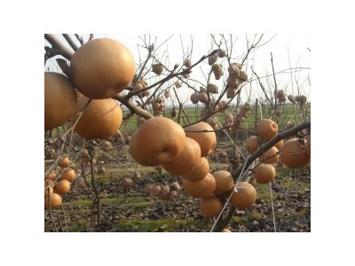 果實(shí)性狀:果實(shí)扁圓形;果實(shí)大型,平均單果重415克,果個(gè)過大者或樹勢衰弱時(shí)果形不正。果皮黃褐色,果點(diǎn)較小,中密,果面較光滑。套袋果果皮淡黃色,果點(diǎn)不明顯。果肉白色,肉質(zhì)細(xì)脆,汁多,石細(xì)胞少,可溶性固形物含量12.0%~16.0%,味酸甜可口,有類似二十世紀(jì)梨的香味,品質(zhì)上。成熟極晚,10月中下旬成熟,耐貯性極強(qiáng)。