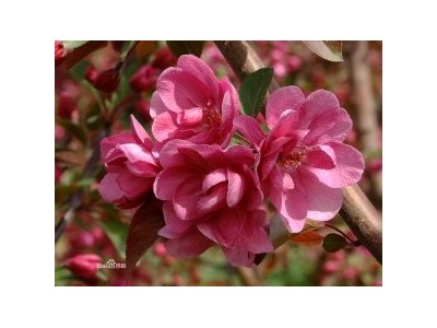 小喬木,高5~7m,冠幅4~5m,樹形為開放的圓形,干深褐紅色。葉片橢圓形,先端漸尖,鋸齒淺。4月上旬始花,花蕾深粉色,表面鄒折,開放后花深紅色,并逐漸變淺,花重瓣,花瓣13枚左右,上有白色斑紋,量大密集,直徑5cm;果實暗紫紅色,表面有一層藍紫色蠟霜,球形,直徑1.8cm, 8月底至9月初成熟,轉(zhuǎn)為黃色后脫落。凱爾斯海棠枝條斜展,又是獨特的重瓣品種,花量大,花密集,但果實早落。