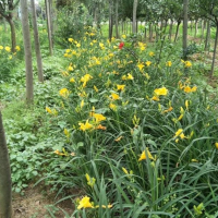 金娃娃萱草 是萱草的人工栽培的園藝品種。地下具根狀莖和肉質(zhì)肥大的紡錘狀塊根。葉基生,條形,排成兩列,長(zhǎng)約25厘米,寬1厘米。株高30厘米,花莛粗壯,高約35厘米。螺旋狀聚傘花序,花7至10朵?;ü诼┒沸?,花徑約7至8厘米,金黃色?;ㄆ?至11月(6至7月為盛花期,8至11月為續(xù)花期),單花開放5至7天。
