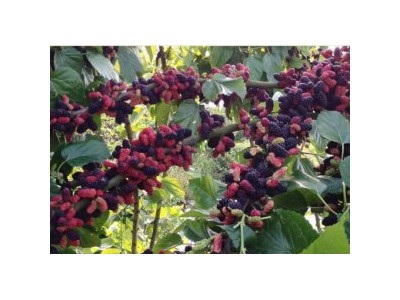 無果桑新品種—椹莓098是山東省果樹科技人員經(jīng)過六年的時(shí)間,選育出的優(yōu)系單株,編號(hào)是098。 該品種樹形開張,枝條細(xì)長(zhǎng),花果極多,果實(shí)較大,圓筒形,平均單果重3.8克,**大果重10.5克。果實(shí)成熟后由紫紅色到紫黑色,果面光澤性強(qiáng),顏色鮮艷,光亮美觀,象黑珍珠一樣。口感酸甜適口,出汁率74-78%,可溶性固形物9一16%,貨架期5天左右。第二、三次結(jié)果為付芽結(jié)果,分別在8、10月份,果個(gè)較大,一般在3克以上。該品種生長(zhǎng)快、產(chǎn)量高,二年生樹平均株產(chǎn)3公斤左右,三年生樹平均畝產(chǎn)2000公斤以上。用該品種建大棚,可實(shí)現(xiàn)4月份栽植,10-11月份扣棚,元旦、春節(jié)、五一上市,畝產(chǎn)可達(dá)1000-1500公斤,每公斤60-200元,畝收入六萬元以上。葉片可養(yǎng)蠶或炒茶,果實(shí)可加工成罐頭、果汁、酒、茶、還可以加入酸奶中,應(yīng)用廣泛,速凍果和加工品市場(chǎng)出口前景廣闊。該樹種適應(yīng)性廣,抗性強(qiáng)、生長(zhǎng)快,結(jié)果早,效益好,果實(shí)美觀,采摘期長(zhǎng),是當(dāng)前建設(shè)生態(tài)采摘園的首選品種。也是山區(qū)丘陵地區(qū)**有發(fā)展前景的致富項(xiàng)目之一。