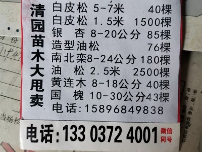 夲苗圃因故清園處理大小苗木,有意者連系,數(shù)量不限。5一7米白皮松40棵,1,5米2仟棵,油松2,5米左右2仟棵,銀杏8一20公分90棵,南北欒,國槐,五角楓等,電話15896849838:13303724001
